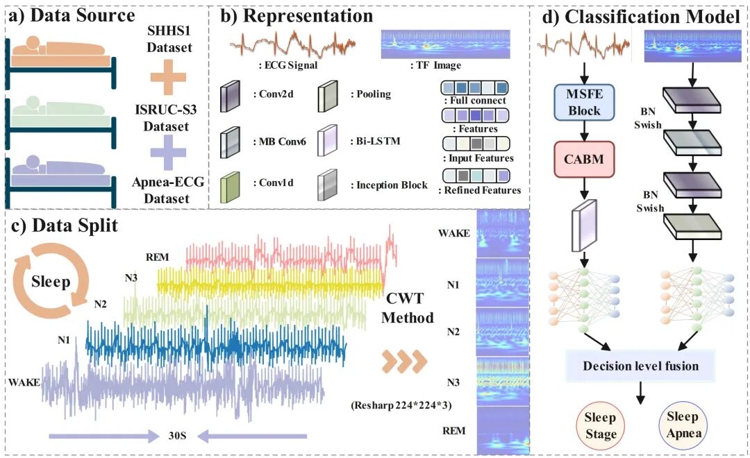 睡眠分期对于分析睡眠质量和诊断睡眠相关脑疾病具有重要意义。随着“中国脑计划”的深入实施及“十五五”规划对脑科学与类脑研究的初步战略布局,如何通过非侵入式、居家化的手段实现对大脑功能状态的精准评估,已成为神经科学与人工智能交叉领域的重大命题。多导睡眠图(PSG)是睡眠分期的常用方法。它通过记录脑电图(EEG)、心电图(ECG)、眼动图(EOG)和肌电图(EMG)等多种生理信号监测睡眠状态。然而,这些信号的分析很大程度上受经验和主观状态的影响,因此解读结果往往存在主观差异。鉴于人工分析PSG信号既耗时又费力,这些方法通常对下游任务的适应性有限且依赖于多通道信号或EEG数据进行睡眠分期分类,且佩戴相关设备通常会给受试者带来不适。相比之下,单导联信号为睡眠分期分类提供了一种更便捷舒适的替代方案。