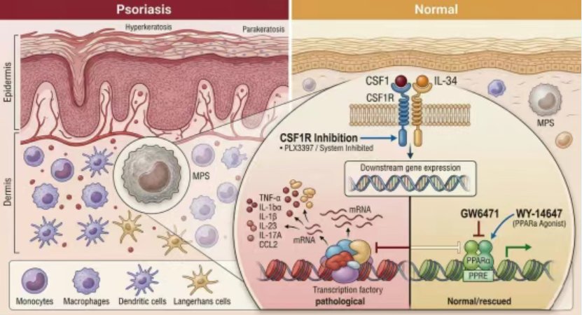 该研究从单细胞精度重新定义了CSF1Rhⁱᵍʰ MPS细胞在顽固性炎症中的核心地位,率先提出CSF1R-PPARα轴作为银屑病的关键致病通路,并揭示了系统性干预的不可替代性。这一发现为开发能够同时实现清除致病细胞储库与主动诱导炎症消退的双效靶向治疗策略奠定了坚实基础。