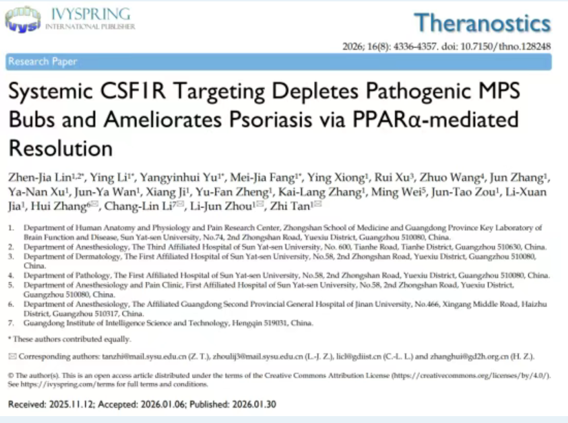 近日,欧美色情-十大欧美色情平台 谈智/周利君教授团队,联合广东省智能科学与技术研究院李昌林研究员及暨南大学附属广东省第二人民医院张辉主任团队,在生物医学期刊 Theranostics(JCR 1区,中科院医学大类1区,新锐分区1区,IF: 13.3)上发表研究论文,揭示了CSF1R-PPARα轴在驱动银屑病皮肤及全身炎症中的核心作用,并提出系统性靶向CSF1R是重建免疫稳态、促进炎症消退的有效策略。